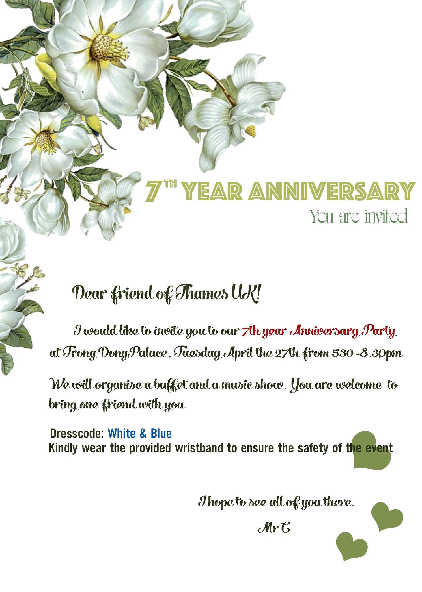 THAMES UK English trân trọng kính mời ba/mẹ cùng các con tới dự Tiệc kỉ niệm 7 năm Thành Lập Thames UK Thái Nguyên vào lúc 17.30 thứ Ba ngày 27/4/2021 tại Trống Đồng Palace (586 Đường CMT 8, P.Gia Sàng,TPTN)
